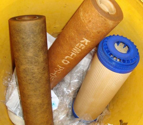 随着使用时间的增加,净水机滤芯过滤下来的杂质会堵塞PP棉滤芯的过滤空,反过来可能会对进来过滤的自来水造成二次污染的。活性炭滤芯则会吸附饱和,失去吸附能力。一般来说PP滤芯3个月就需要更换,活性炭滤芯6个月左右需要更换。这两种滤芯都不能有效去除细菌和有机污染微生物。饱和后失去净水效果不容易发现。下面贴张图给大家看看饱和后的滤芯的图。
