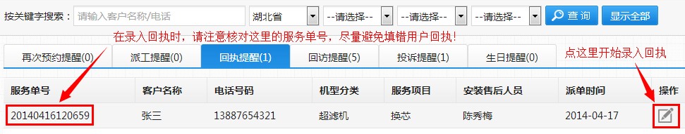 在“回执提醒”页面,填写“回执”的时候,需要注意核对《客户服务单》上的单号一定要和回执提醒页面一样,尽量避免填错用户回执,而导致后面回访时出现实际工作与系统提示信息不一致的尴尬!