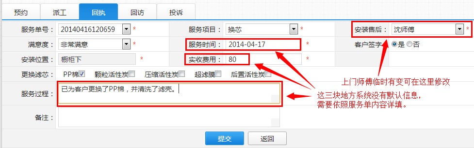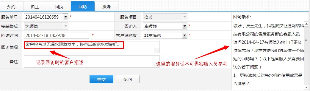 保存提交回执记录,建议三天后在与客户联系回访,因为大多数换芯或安装时的漏水事件,可能不会再当天发生,三天后回访也是为了提醒客户注意检查有无漏水情况发生。