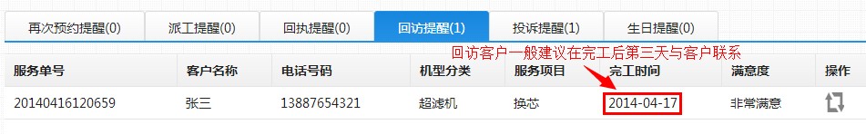 其他提醒:是指除滤芯提醒以外的工作流程提醒,包括如下图中所示:因故没预约成功需要“再次预约提醒”;预约成功后,在需要安排师傅上门当天的“派工提醒”;派工后需要收回工单,并在水事易系统中录入现场服务记录的“回执提醒”;服务结束后客服人员需要定期给客户回访,确认服务过程、服务质量以及提醒用户注意日后注意事项的“回访提醒”;发送投诉纠纷时,需要及时处理的“投诉提醒”;如果系统记录了客户生日,还会定时提醒您问候客户。