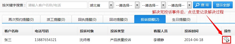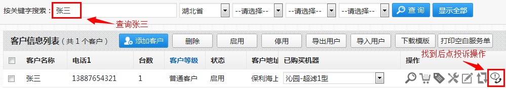 第一步:这里假设客户张三在更换完滤芯后第五天打来投诉电话,客服可以在“客户信息列表”先搜索到张三这位用户,并点击操作栏的投诉按钮,如下图: