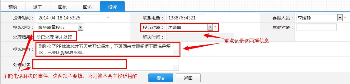 第三步:处理投诉——对于漏水事件,只能安排师傅上门处理,那么就添加一条预约记录,走派工流程解决,相应工作流程可查阅“派工流程管理”,这里就不详述了。处理完漏水事件后,记得在“投诉提醒”里面记录“处理过程”和“解决时间”,点击如下图操作栏的“查看投诉”按钮。未处理的投诉会一直提醒!