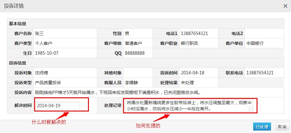 如下图填写完处理记录后,点击“已处理”,即可保存,供日后查询。