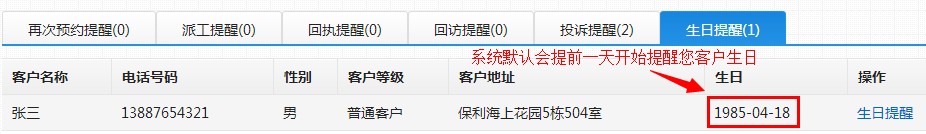 添加客户资料时,如果保存了客户的“出生日期”,那么系统会在此客户生日到期前一天告知您问候客户,如下图: