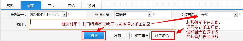 下图的派工页面可直接安排空闲的师傅上门服务,提交后系统会提示您打印派工单。