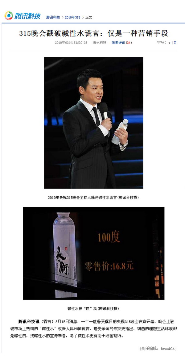 剪报图片:315晚会戳穿碱性水的谎言 仅是一种营销手段